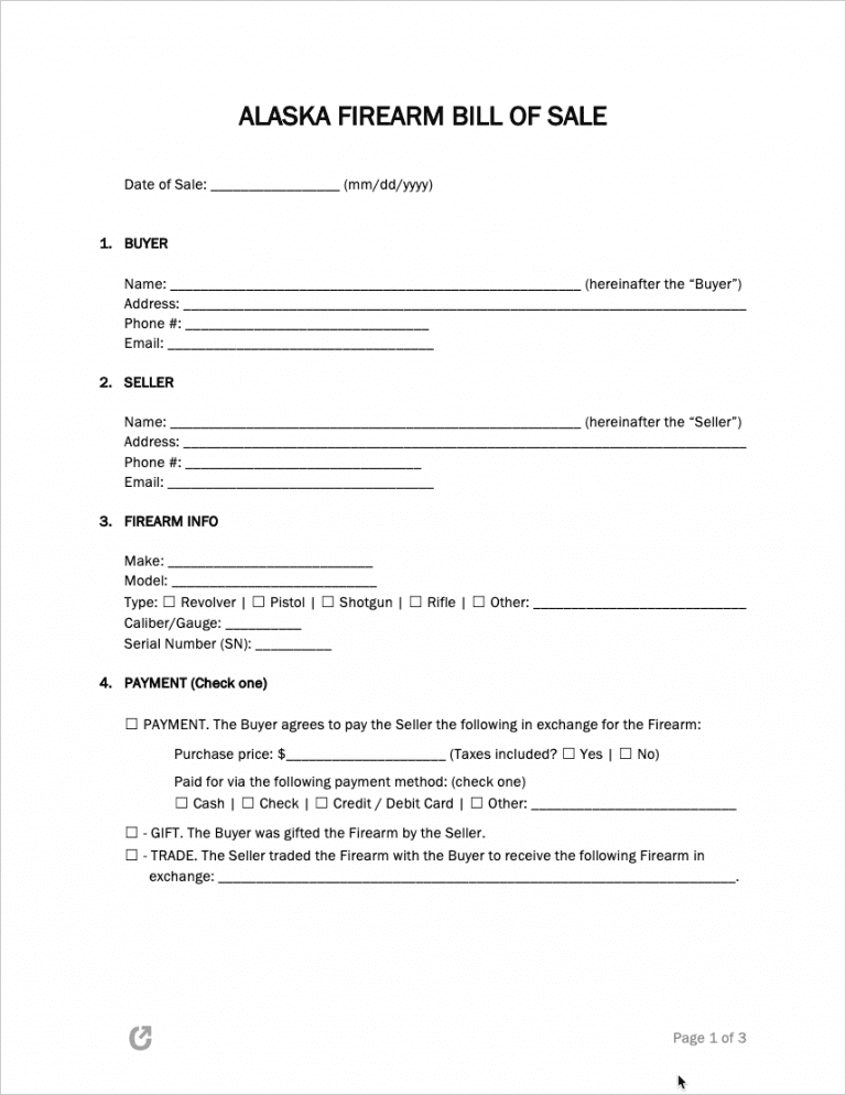 An Alaska bill of sale introduces a summary of the method in which a merchant gave a buyer an asset. The state does not allow citizens to own unregistered automatic or semi-automatic firearms, sound mufflers, or rifles and shotguns with a barrel exceeding the approved maximum length. Only individuals who have a federal permit can possess or use these types of guns.