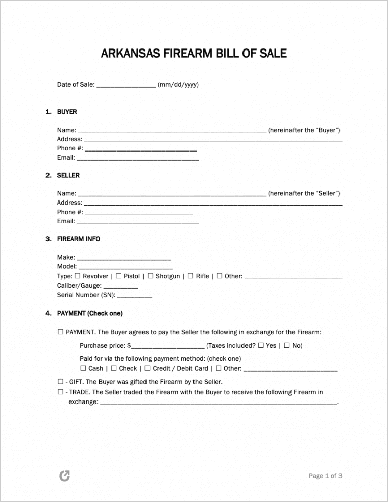 An Arkansas gun bill of sale lists the conditions of a firearm deal between a buyer and seller. The selling process begins when a buyer learns of the sale. They contact the merchant and usually view the item in person. If the purchaser decides they want it, they discuss the deal with the owner before completing a bill of sale form.