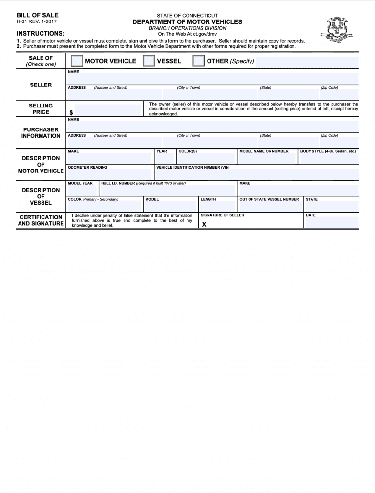 A Connecticut bill of sale acts as a formal arrangement of how a deal involving cash, trade, or gift will occur. The buyer and seller finalize the form before making the swap, thus making each party accountable for the specified arrangement. If either person fails to hold up their end of the deal, the other can use this document to hold them responsible legally.