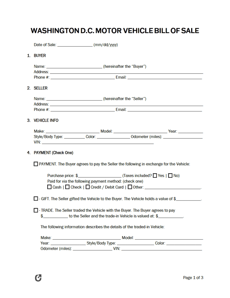 A Washington D.C. bill of sale certifies that two (2) individuals came together to initiate an even exchange of goods or personal property. The form signifies that the buyer and seller settled on the terms and conditions of the transfer without dispute. It also ensures that the previous owner has provided truthful information about the item and notified the new owner of any needed repair work or damages.