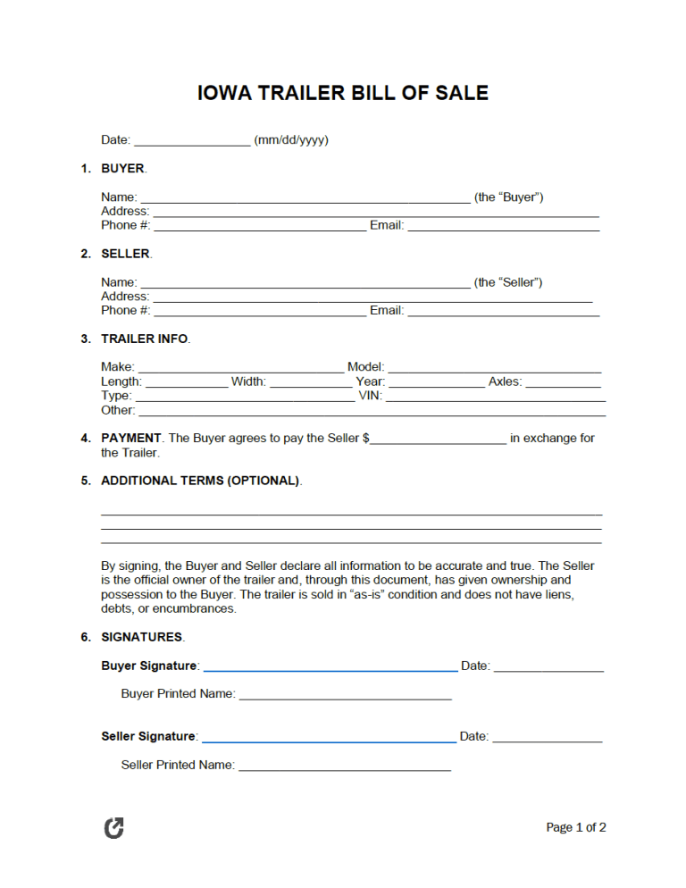 An Iowa trailer bill of sale allows the buyer and seller to draft a deal between one another. As soon as both parties agree to the listed terms, they sign to show consent. After that time, they cannot make changes to the document. Instead, they must complete a new bill of sale or edit the information before a notary public, who must also sign. Witnesses do not need to attest to the form; however, buyers and sellers can have another person sign to verify the sale.