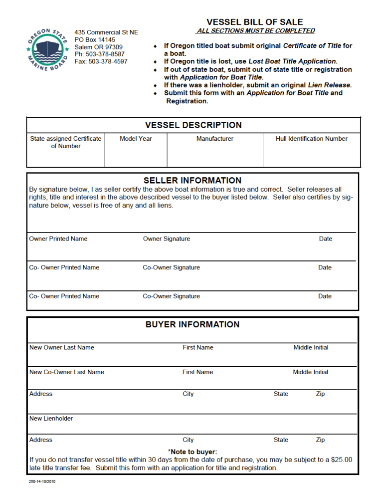 After completing the online application, the resident must mail the required ownership documents and payment receipt to the Oregon State Marine Board. Once the facility processes and approves the information, the owner receives the boat’s title and registration by mail.