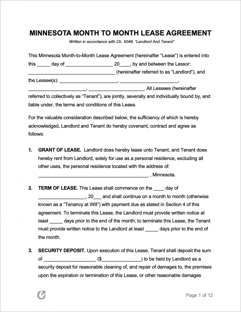 The Minnesota Month to Month Rental Agreement is a form used to rent property to lessees (renters) on a monthly basis. At the end of each month, the lease renews automatically. It will continue to renew until the lessor (landlord) or lessee(s) terminate the contract with a notice of one (1) month. Other than the short-term nature of the agreement, it is very similar to standard yearly leases.