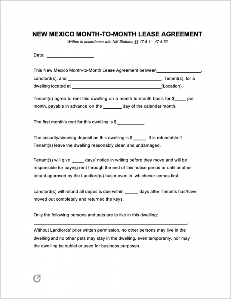 The New Mexico Month-to-Month Lease Agreement is a written document used for leasing a rental on an incremental basis (no set end date). The form was created in-line with NM’s “Property Law” statutes and allows for the creation of rules and obligations that both a landlord and tenant(s) have to follow until either party ends the contract with a notice of thirty (30) days.