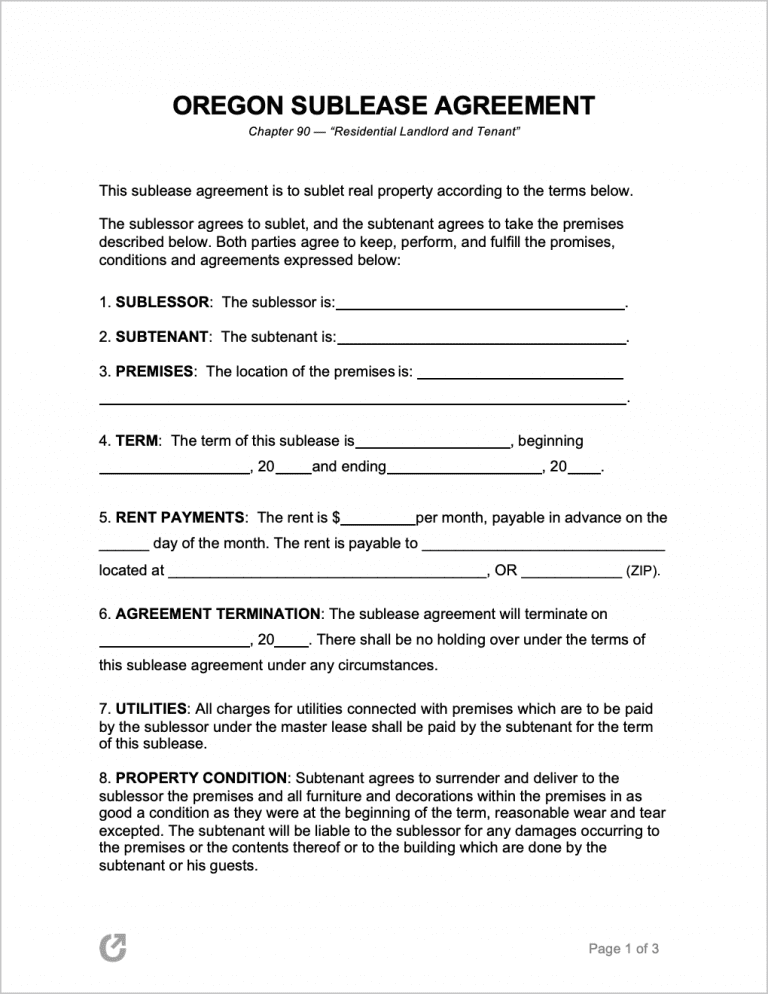 Subleasing provides a tenant with the opportunity to leave a rental dwelling but still maintain their contractual obligation to make monthly rental payments to their landlord. They must, however, ensure they record the terms of any sublease they initiate in a Oregon Sublease Agreement. This contract is created by the tenant together with the party they wish to sublet the property to (an individual referred to as the sublesee). It is therefore not the same as an Oregon Lease Agreement, as a lease agreement only concerns the lease of a property by the landlord directly to the tenant.