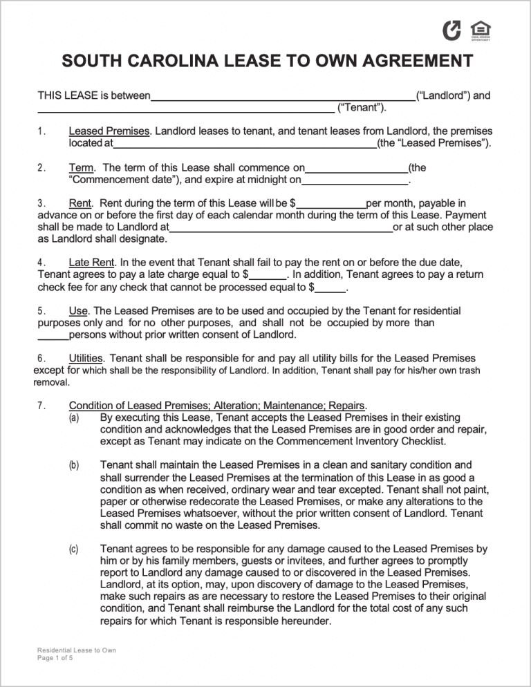 South Carolina Lease to Own Agreement