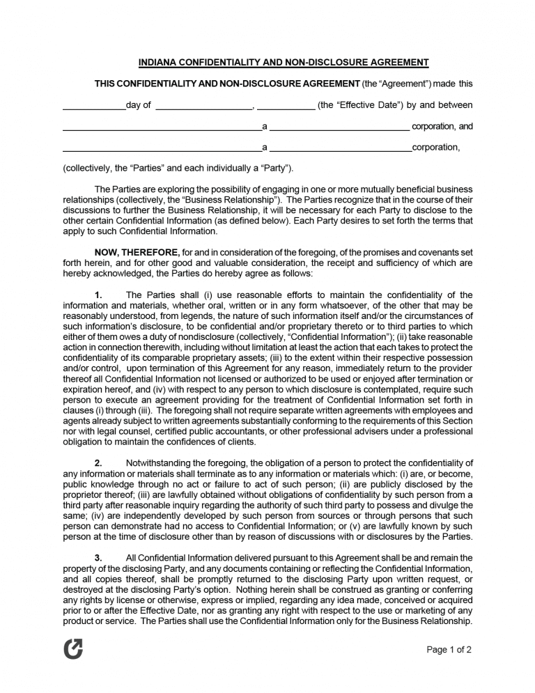 An Indiana non-disclosure agreement (NDA) is a legal document that binds an employee or other entity from wrongfully sharing a company’s private information. The form can be used as either a bilateral or unilateral agreement, meaning it can be used in situations where just one (1) party is sharing information (unilateral) as well as in situations with both parties sharing information to each other (bilateral). The form is commonly used in situations such as: