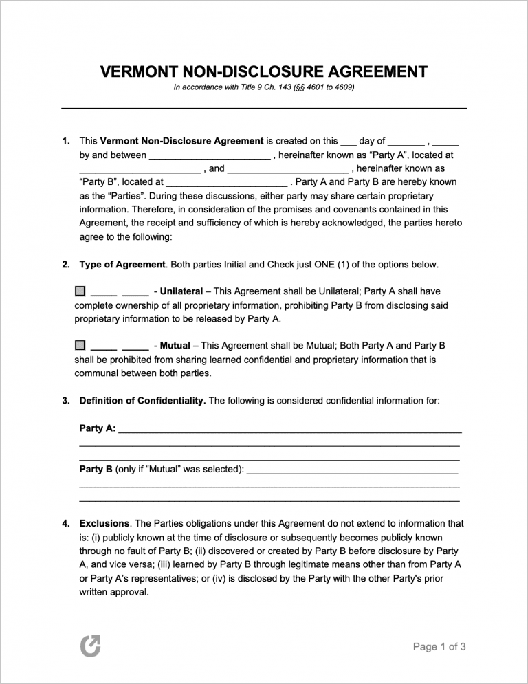 Download the Vermont Non-Disclosure Agreement, a business document that protects businesses, inventors, and other professionals from having their trade secrets stolen and/or leaked. Also called a “confidentiality agreement,” the document is commonly used in situations where secretive information needs to be discussed with persons outside of the company or group. Under Vermont’s Trade Secret Laws, confidential information (i.e. a “trade secret”) is defined as information that derives value from being shielded from public knowledge.