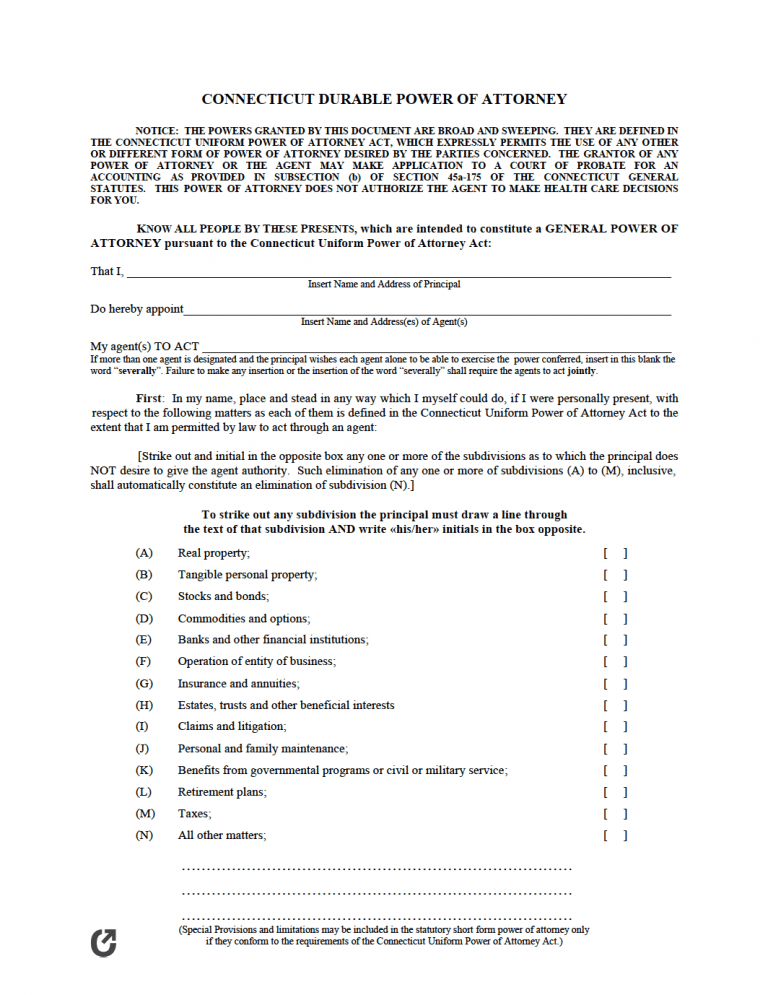 A Connecticut power of attorney form is a form used for permitting a person (the agent) with the ability to act on behalf of another person (the principal). The forms all vary in the amount of power they assign. A limited POA, for example, limits the agent’s power to handling only a few tasks, and will terminate once the tasks have been completed. A general POA, on the other hand, can grant an agent with power over the principal’s entire finances, giving them the right to move money out of their financial accounts, purchase real estate, and much more.