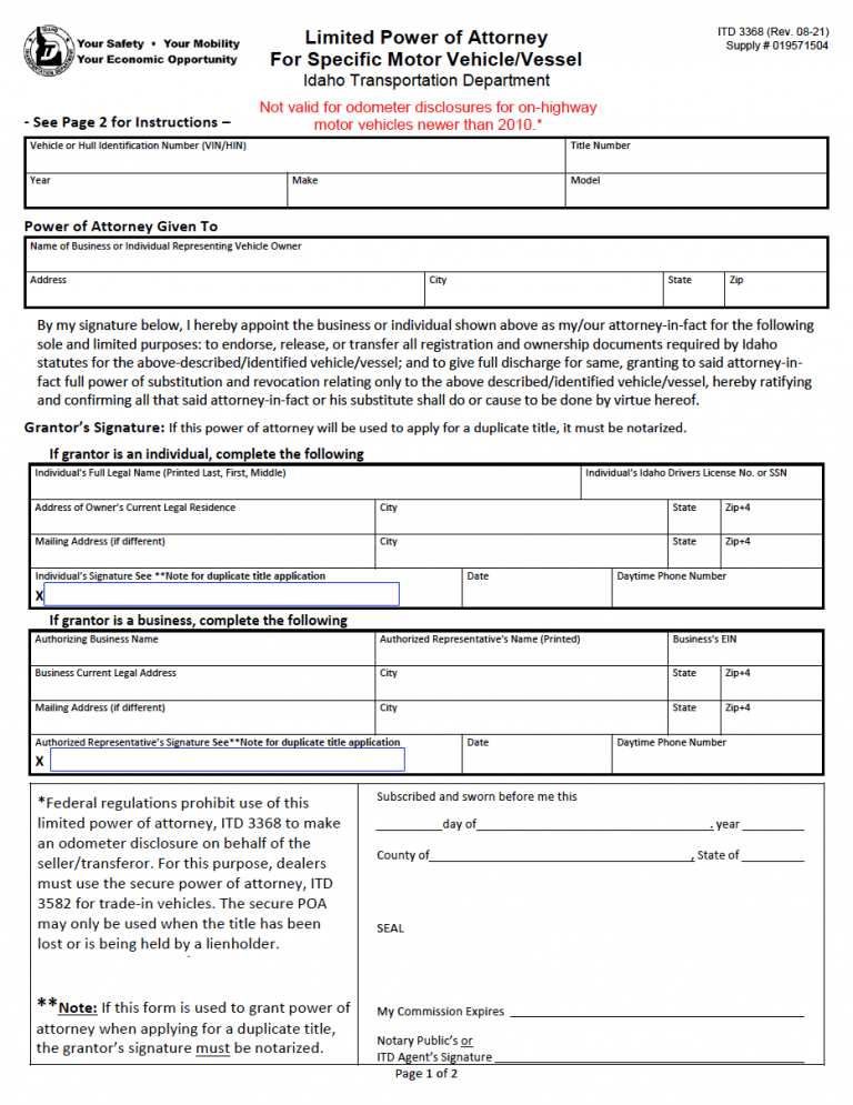 An Idaho motor vehicle power of attorney privileges the attorney-in-fact with the power to manage another person’s vehicle as if it was their own. The document empowers them to buy or sell the vehicle, allow or deny mechanical work, have it inspected, or complete other tasks that the owner would do themselves. However, the attorney-in-fact cannot legally act beyond the boundaries set in the power of attorney.