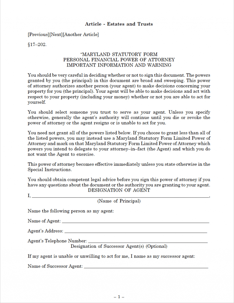 - Maryland Power of Attorney Laws – Title 17, Act 1 and Title 5, Subtitle 6