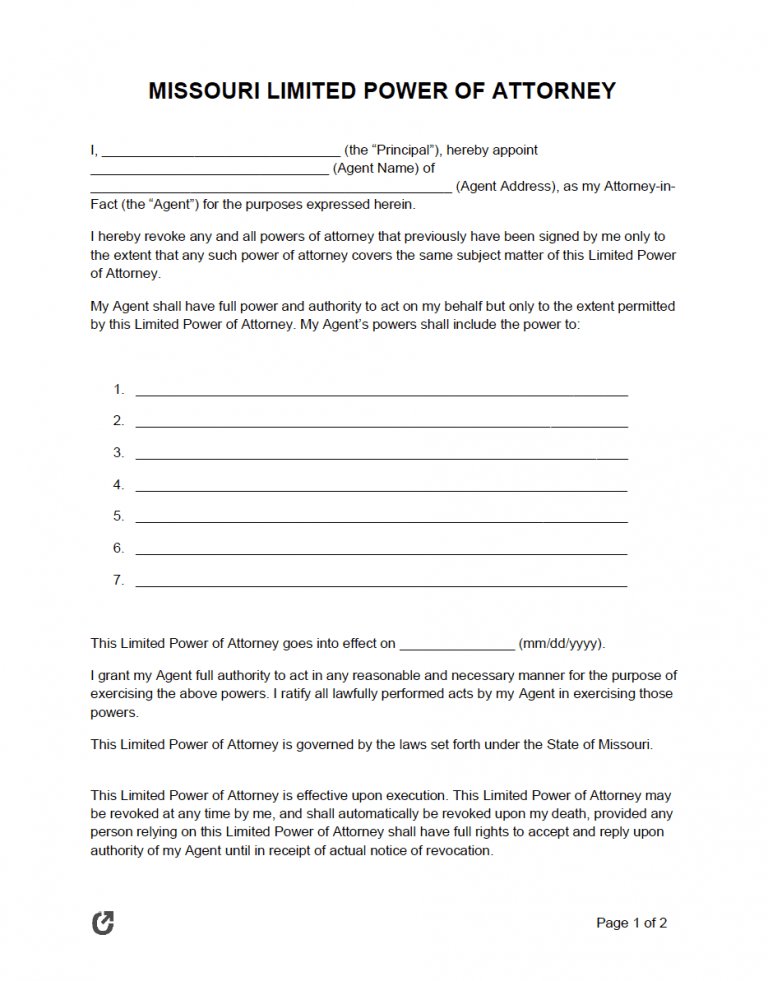 A Missouri limited power of attorney is a two (2) page contract that allows an attorney-in-fact to make one-time decisions and sign documents for a principal. It serves as a record of the arrangement between both individuals.