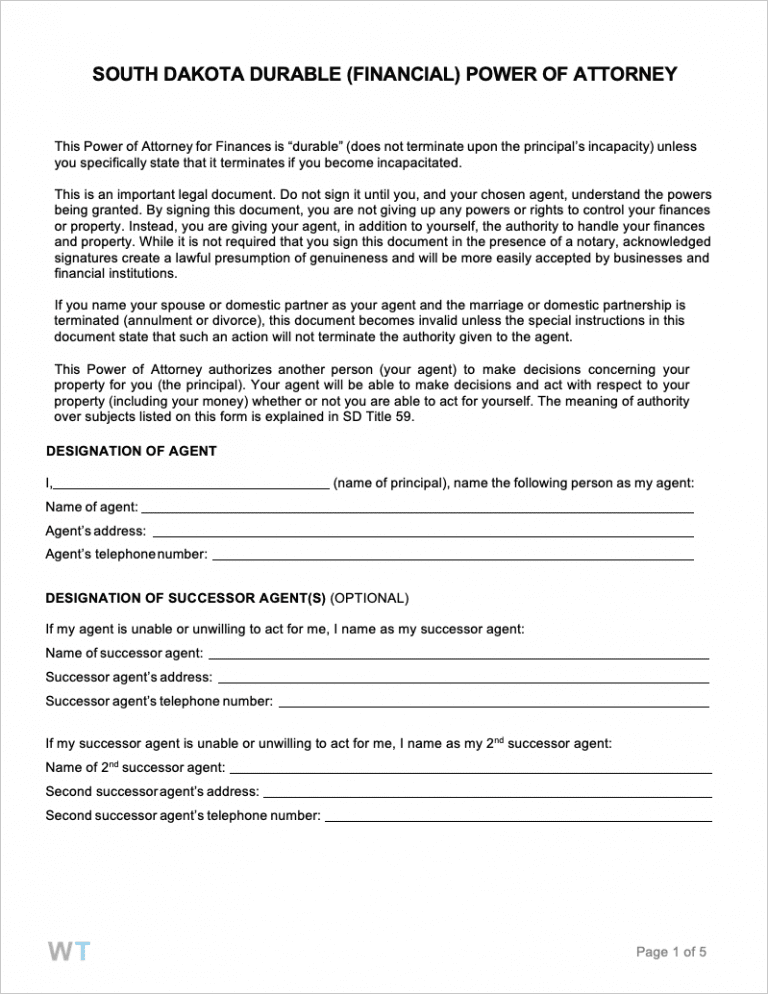 The South Dakota Durable Power of Attorney provides residents of the state with a legally valid means of putting their financial responsibility into the hands of a trusted friend or family member. The powers given with the form are anything but short-lived; they are near-permanent powers designed to give someone a means of keeping their assets in order after being formally declared as “incapacitated” by a doctor. As an example, if one completed and signed a durable POA five (5) years in the past and they got into a horrific car crash rendering them mentally debilitated, the person they specified in the document would have the right to present the form to banks and other institutions to move money, sell real estate, and do any other necessary activities. All actions done by the agent are solely to be in the best interests of the principal. Should that person recover from the crash, their assets would be well managed and in as good, or better, shape than before the accident.