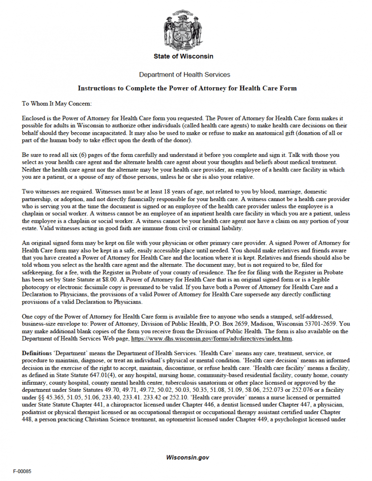 A Wisconsin medical power of attorney is a form completed by a resident of Wisconsin (the principal) to give a person (the agent) the ability to make their medical decisions. The agent must be a trusted family member or friend over the age of eighteen (18). This document does not become effective at signing. Instead, it only gives the agent authority if a physician confirms that the principal cannot speak for themselves. This state of mind is known as mental incapacitation and can occur due to injury, illness, drugs, or disability.