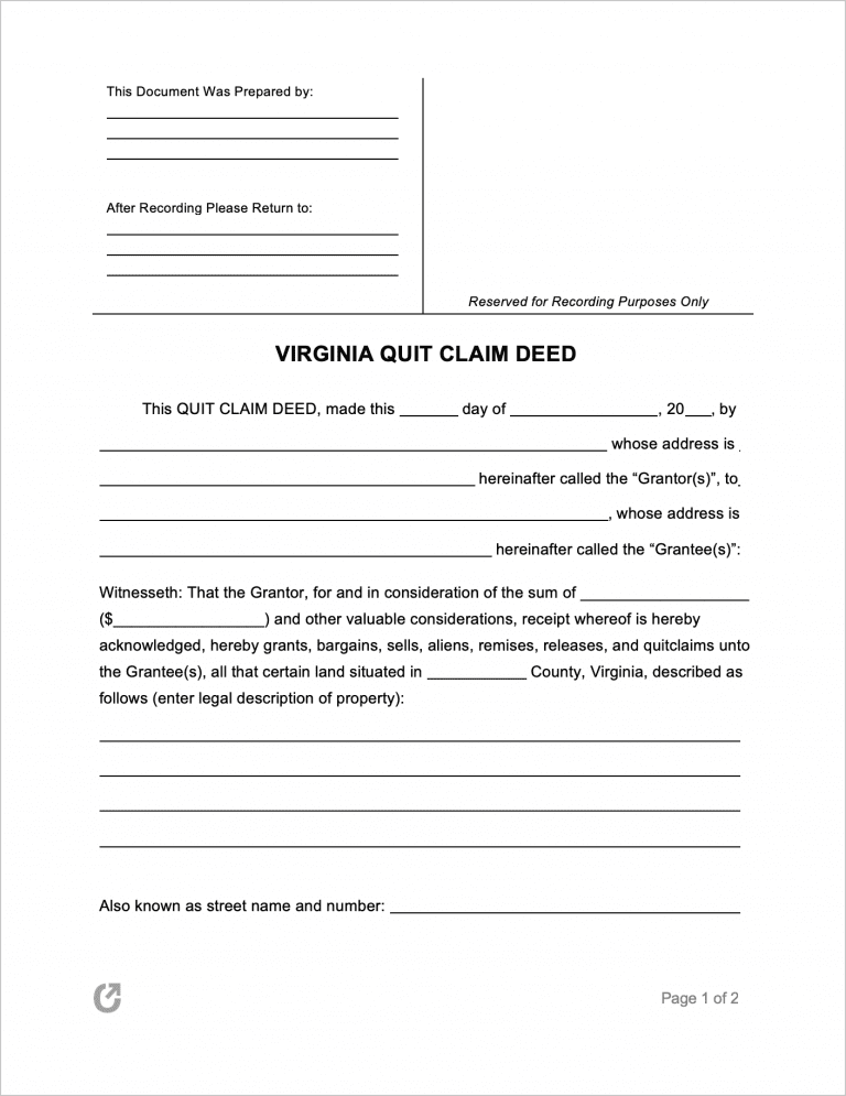 The Virginia Quit Claim Deed is a relatively basic document that outlines an agreement for a Grantor (property owner) to hand over their interest in a property to one (1) or more Grantee(s) (the party that receives the property). While there are no legal restrictions against strangers using the agreement, Grantees are cautioned against entering into one unless they both personally know and trust the Grantor. The reason being that there is absolutely no buyer protection they can fall back on if they receive less interest than they were expecting—or none at all. This could happen if the Grantor either maliciously or accidentally asserts that they have interest, which in fact, they do not have. The easiest way for the Grantee to prevent this from happening is to undertake a title search.